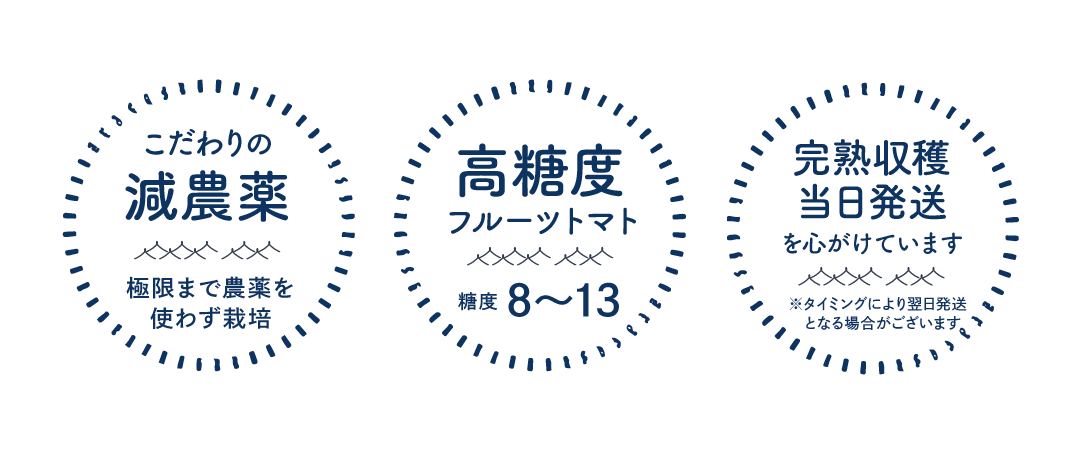 あえて過酷な状態で栽培することで、小さな粒に甘みと旨味がぎゅっと凝縮されます。完熟収穫されたトマトは当日発送が基本。とれたて新鮮なおいしさを、全国へお届けします。